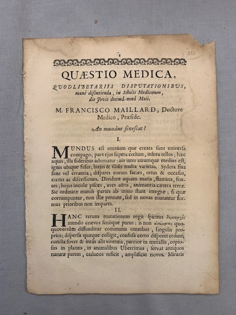 Apud Franciscum Muguet Regis & Facultatis Medicinae Typographi 1695. 4 pages. 24x18 cm Upper right corner paper losstttt