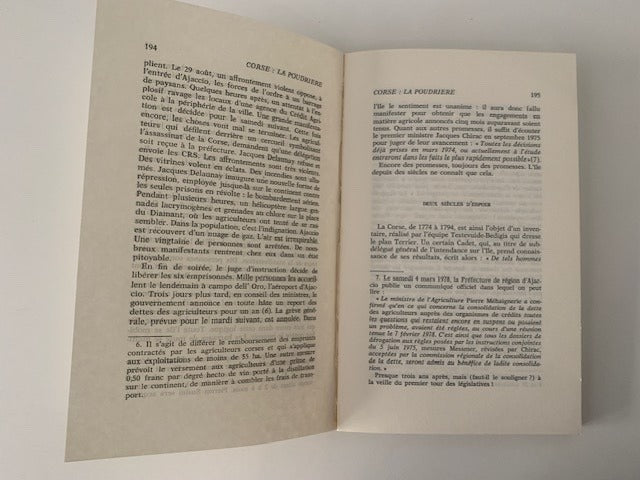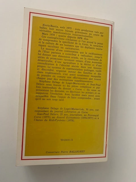 Paris Alain Moreau 1978. 388 Pages. Broché. 13 5x21 5 cm Livre témoin d'une époque qui vit la naissance et l'émergence des mouvements régionalistes puis autonomistes et nationalistes en Corse. Vieux de 40 ans cet ouvrage est encore important à lire pour comprendre la genèse des événements que l'île a connus les 30 dernières années du 20ème siècle. Les causes historiques et économiques les personnages impliqués et les principales étapes d'une radicalisation qui a conduit à ce qu'aujourd'hui la Corse soit dirigée par les partisans d'un statut à part pour la Corse dans l'ensemble français quand ce n'est pas pour certains l'indépendance.