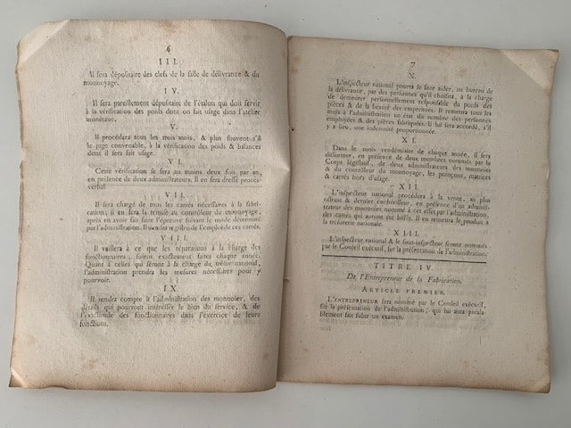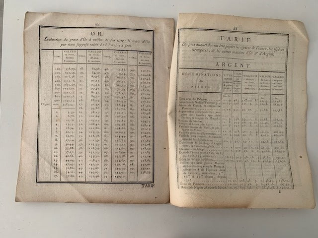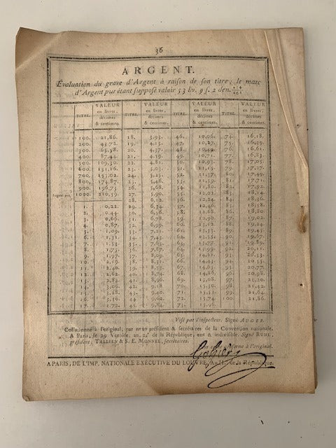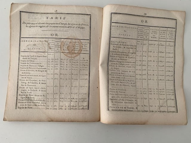 Paris Imprimerie Nationale Exécutive du Louvre 1792. 36 pages 21x26 cm. Etat correcte quelques rousseurs En annexe les Tarif du prix auquel doivent être payée au Changes les espèces de France les espèces étrangères & le autres matières d'Or et d'Argent
