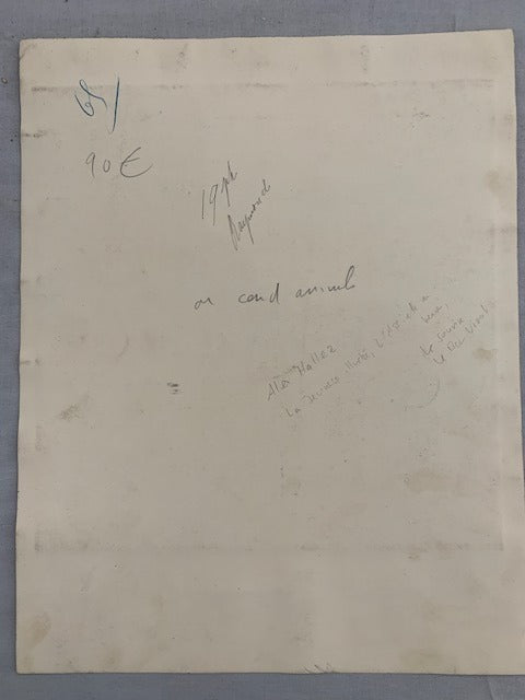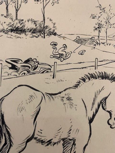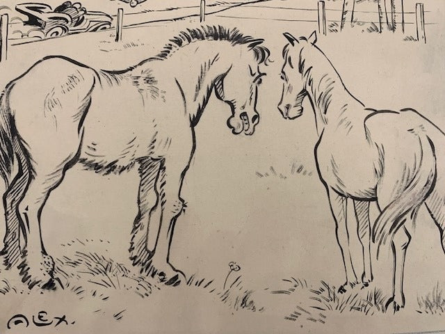 Dessin en encre signé Alex avec bordure en crayon bleu. Collé sur support en carton avec légende manuscrite. 25 5x32 5 cm. Sans date. Bon état Alex (signe aussi de son nom). Dessinateur humoristiquem pratique l'histoire en images entre 1916 et 1921 pour 'Les Belles Images' et 'La Jeunesse Illustrée. Dessins aussi dans : Le Bon Vivant (1901-1909); L'Album Comique de la Famille Le Fétard (1902); Le Diable (1903); L'Assiette au Beurre (1903 & 1906-1907 et 1909); La Caricature (1903-1904; L'Indiscret Le Journal pour Tous (1903-1906); Le Rire (1903-1908 & 1910); Le Sans-Souci (1904); L'Illustré National (1904 & 1908-1909); Le Pêle-Mêlé (!904-1916); Paris s'amuse Sans-Gêne Les Images pour Rire (1905); Qui Lit Rit (1906-1907); Mon Dimanchem Nos Loisirs Le Sourire (1906-1908); Surprise Journal Américain Illustré (1907); Le Patriote Illustré (1908); Mon Copain du Dimanche (1911); L'Amour (1912-1913); Almanach Vermot (1913); L'Auto (1925-1927); Le Petit Illustré Amusant [Dico Solo en Couleurs. Plus de 5000 dessinateurs de presse & 600 supports en France de Daumier à l'an 2000. Edition Aedis]