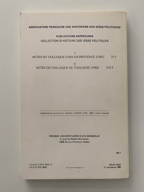 Aix-en-Provence Presses Universitaires d'Aix-Marseille 1985. Broché. 222 pages 15 5x24 cm. Bon état Association Française des Historien des Idées Politiques. Collection d'histoire des idées politiques III