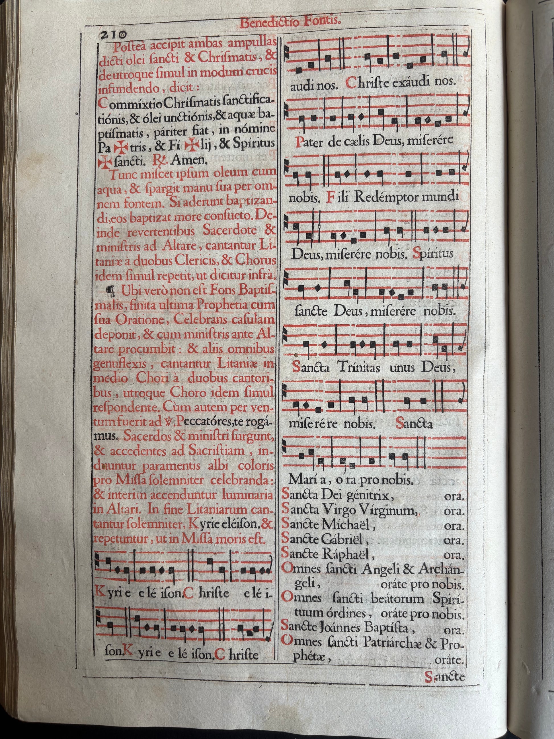 Texte en rouge et noir, nombreux bois et lettrines, musique notée sur portée carrée. XXX; 556 pp., suivie d’un appendice en chiffres romains (116 pp., Index 4 pp. Édition post-tridentine typique de la production lyonnaise de Valfray, illustrée d’un grand soin typographique.