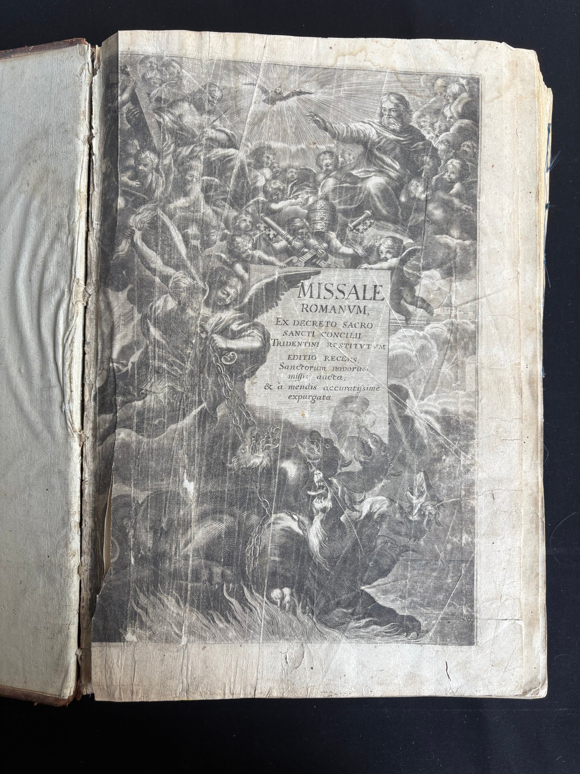 1. [Frontispice gravé], spectaculaire composition baroque représentant Dieu le Père en gloire, la tiare papale et les clefs de Saint-Pierre, entourées d’anges et de figures allégoriques.