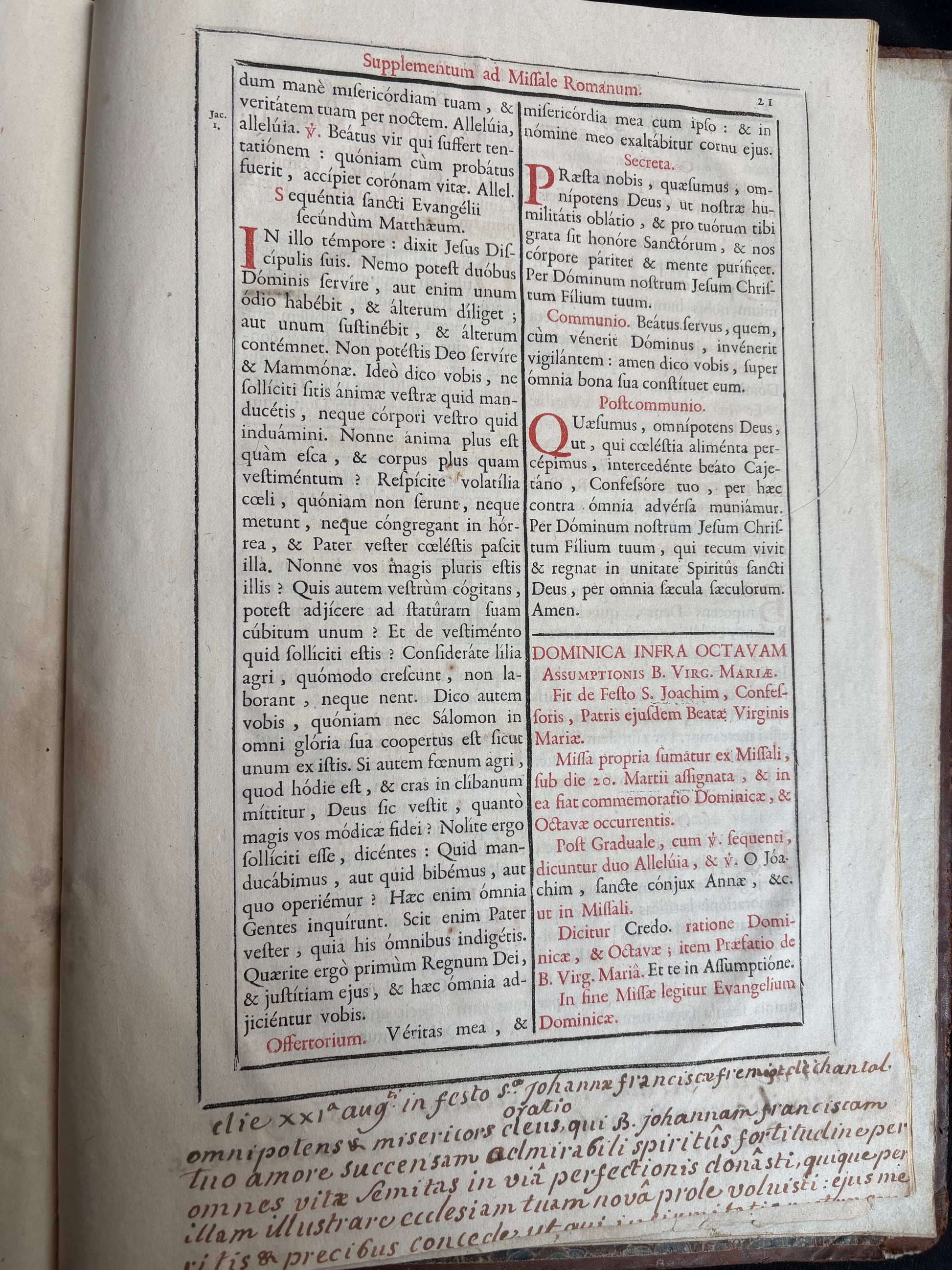 – Annotations manuscrites ponctuelles dans le corps du Missale Romanum (renvois, corrections, ajouts de fêtes).