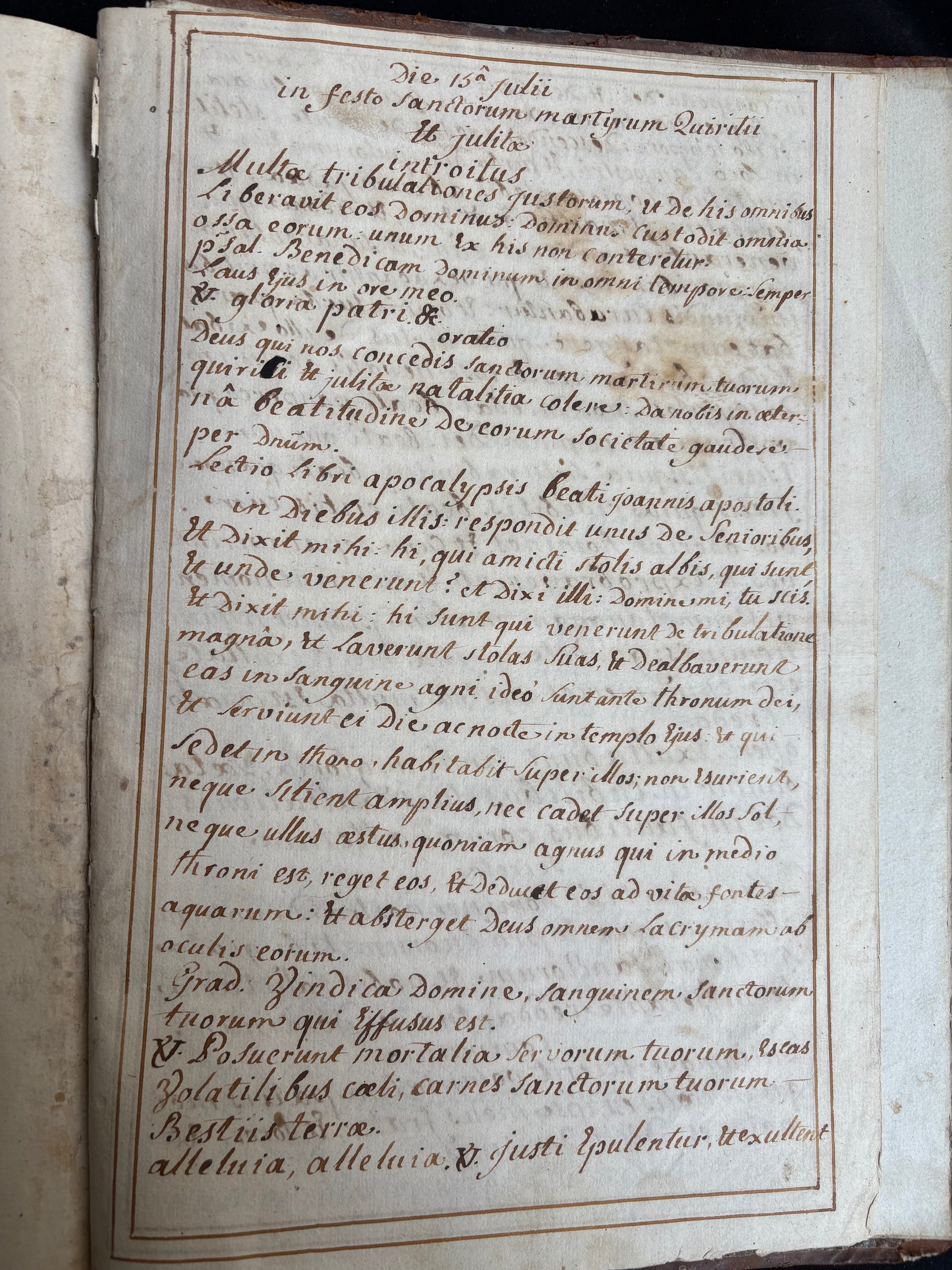 5. Cahier manuscrit (6 pages in fine), en latin, de belle main régulière du XVIIIᵉ siècle, ajoutant plusieurs messes ou collectes locales (probablement fêtes propres d’un saint ou d’une paroisse provençale).