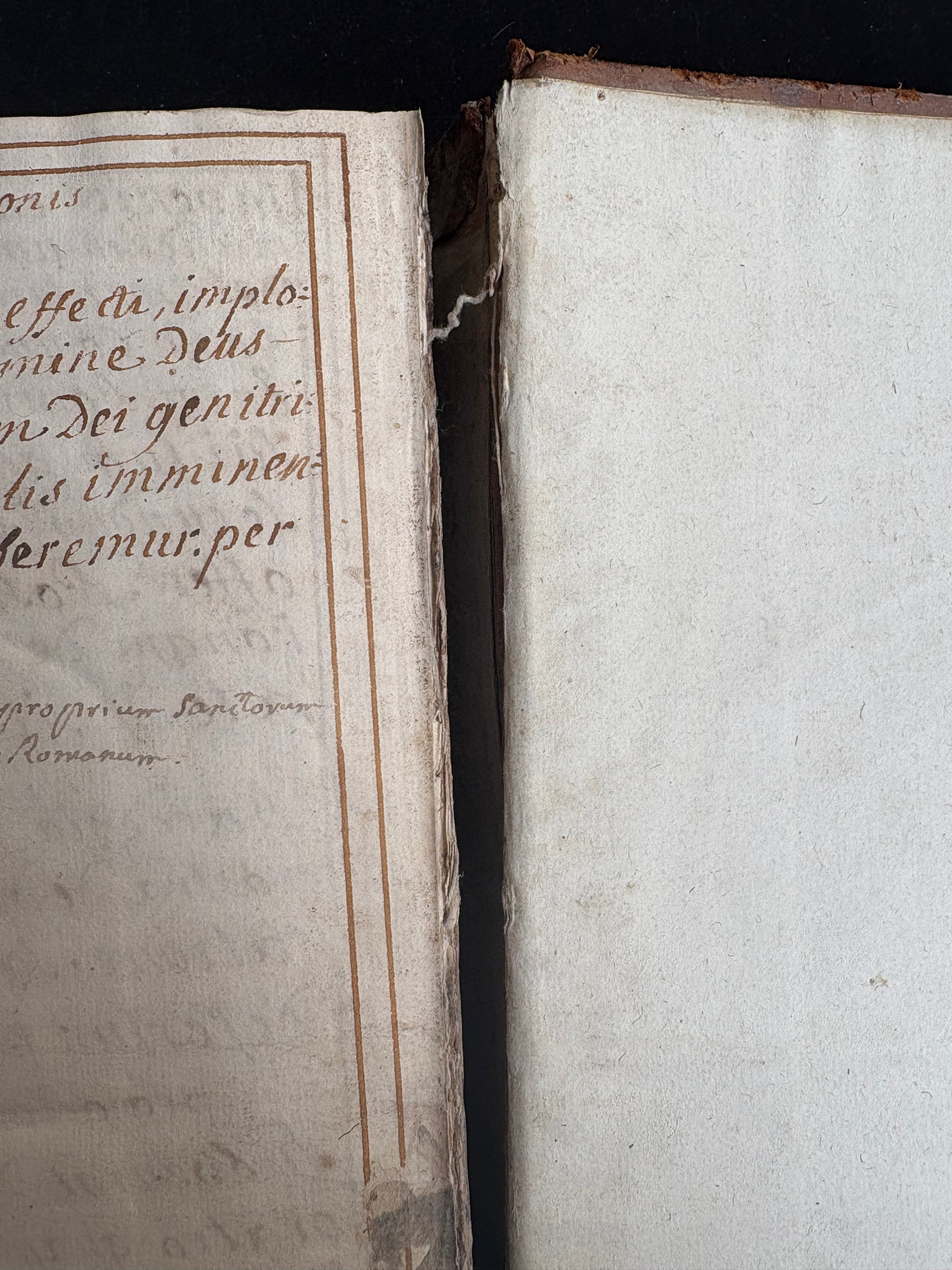 Exemplaire composite rare et de belle cohérence, réunissant un Missale Romanum de 1696 et ses mises à jour imprimées et manuscrites du XVIIIᵉ siècle — précieux témoignage d’usage liturgique provençal.