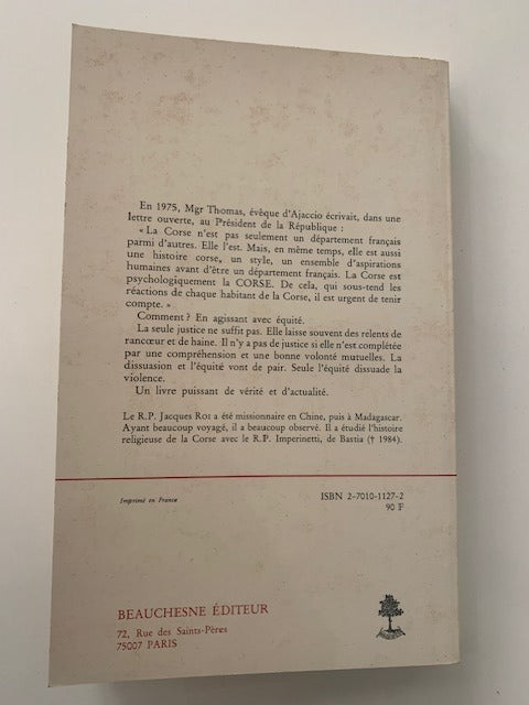 Paris Beauchesne 1986. 160 pages. Broché. 13 7x21 5 cm. Couverture avec des taches sinon bon état En 1975 Mgr Thomas évêque d'Ajaccio écrivait dans une lettre ouverte au Président de la République : « La Corse n'est pas seulement un département français parmi d'autres. Elle l'est. Mais en même temps elle est aussi une histoire corse un style un ensemble d'aspirations humaines avant d'être un département français. La Corse est psychologiquement la CORSE. De cela qui sous-tend les réactions de chaque habitant de la Corse il est urgent de tenir compte. » Comment ? En agissant avec équité. La seule justice ne suffit pas. Elle laisse souvent des relents de rancœur et de haine. Il n'y a pas de justice si elle n'est complétée par une compréhension et une bonne volonté mutuelles. La dissuasion et l'équité vont de pair. Seule l'équité dissuade la violence. Un livre puissant de vérité et d'actualité. Le R.P. Jacques ROI a été missionnaire en Chine puis à Madagascar. Ayant beaucoup voyagé il a beaucoup observé. Il a étudié l'histoire religieuse de la Corse avec le R.P. Imperinetti de Bastia (1984).